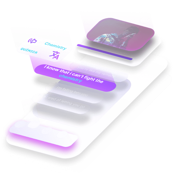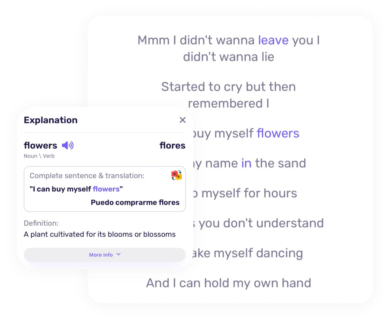 Os aprendizes podem clicar em qualquer palavra na letra da música para tradução instantânea para o seu idioma nativo.
